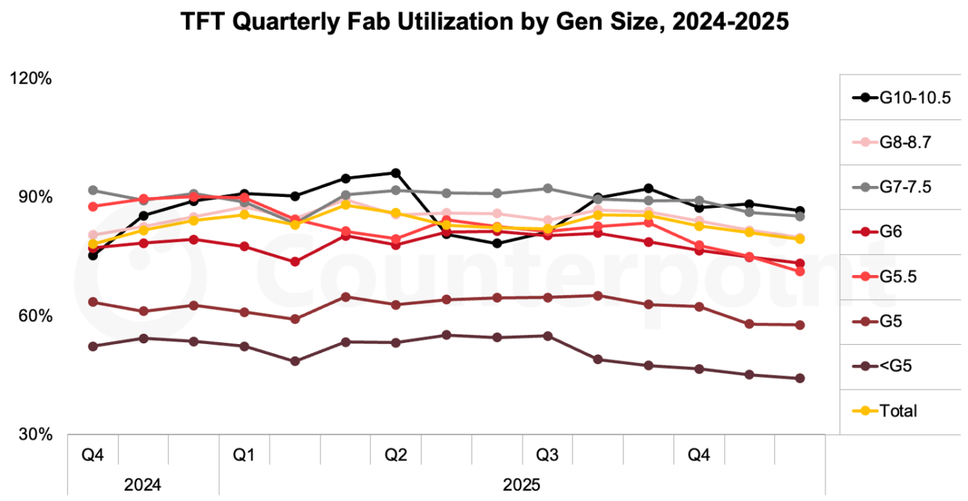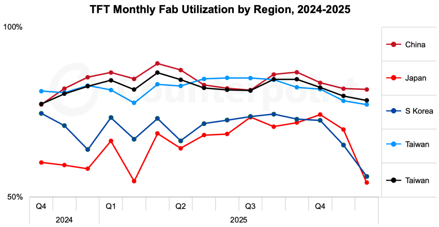 カウンターポイントリサーチが今月発刊した Quarterly All Display Fab Utilization Report 最新号によると、予想を上回る第3四半期の後、フラットパネルディスプレイ生産工場の稼働率は2025年第4四半期に低下傾向にあります。2025年第3四半期の生産量増加は在庫の増加につながり、年末商戦期の需要予想を上回るリスクがあります。